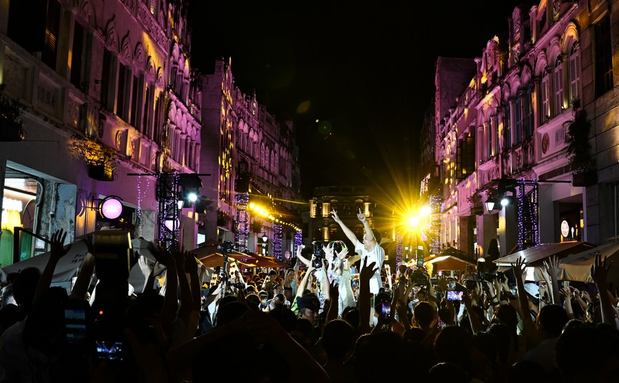 Tourists watch performance at the Qilou old street in Haikou, south China's Hainan Province, Aug. 22, 2023.(Xinhua/Yang Guanyu)