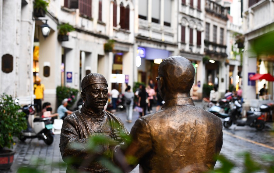Statues are pictured at the Qilou old street in Haikou, south China's Hainan Province, Aug. 21, 2023. (Xinhua/Yang Guanyu)■