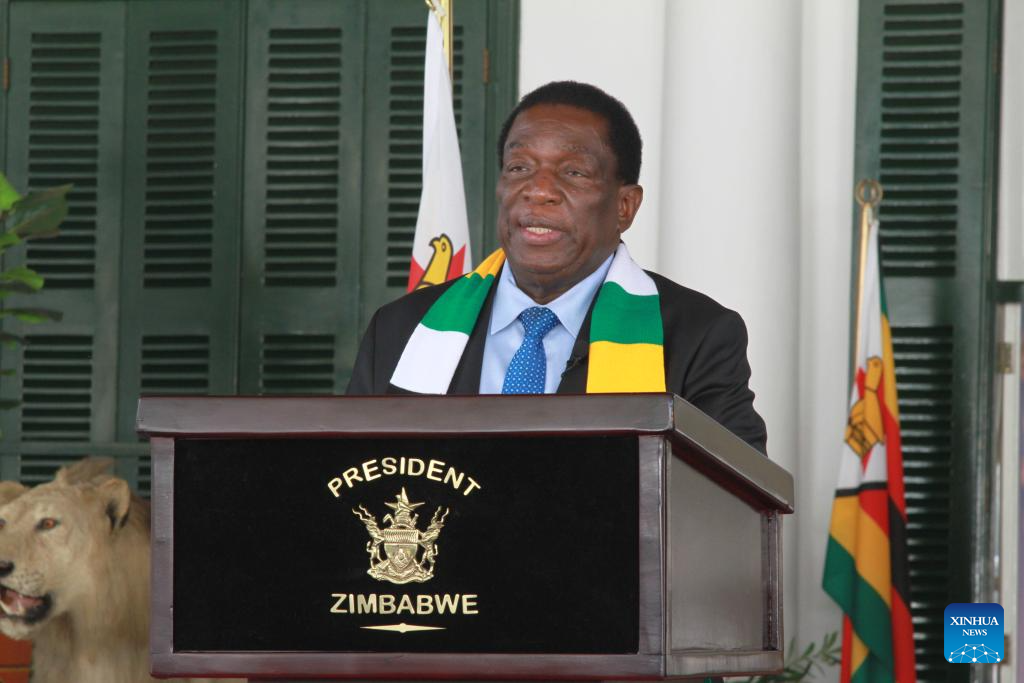 Zimbabwean President Emmerson Mnangagwa addresses the media at State House in Harare, Zimbabwe, on Aug. 27, 2023. Zimbabwean President Emmerson Mnangagwa has been re-elected for a second five-year term, after garnering 52.6 percent of the total votes cast in the Aug. 23-24 elections, the Zimbabwe Electoral Commission (ZEC) announced on Saturday. (Photo by Tafara Mugwara/Xinhua)
