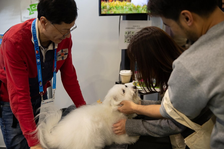 Visitors fondle a dog during the Dog Lovers' Festival in Sydney, Australia on Aug. 26, 2023. (Xinhua/Hu Jingchen)