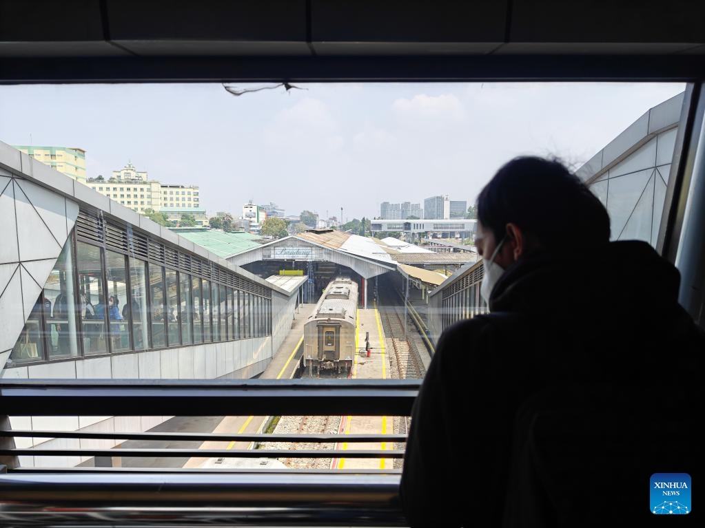 A train from Jakarta stops at Bandung Station in Bandung, Indonesia, Aug. 27, 2023. (Xinhua/Xu Qin)