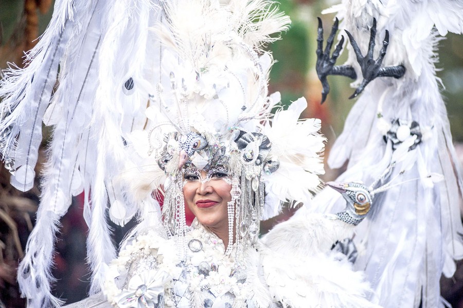 A performer participates in Jogja Fashion Carnival at Malioboro street in Yogyakarta, Indonesia, on Aug. 26, 2023. (Photo by Agung Supriyanto/Xinhua)■