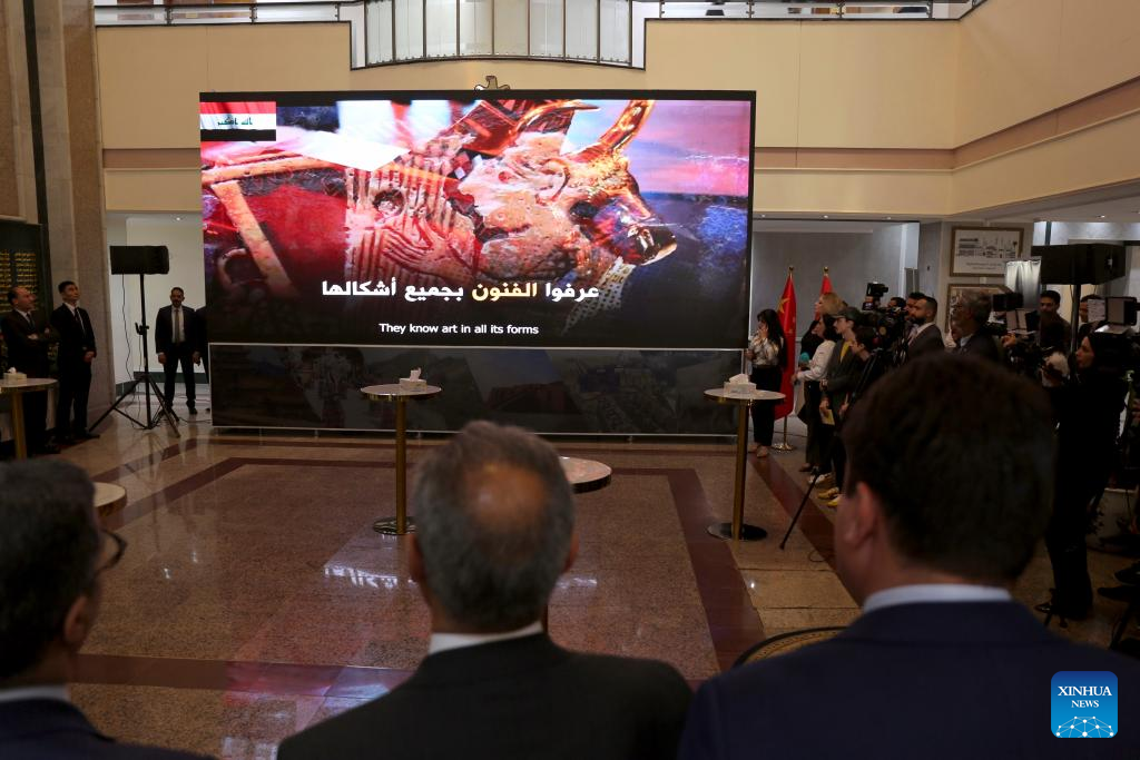 Guests watch a video showing the ancient cultures of China and Iraq during a ceremony to mark the 65th anniversary of diplomatic ties between Iraq and China in Baghdad, Iraq, Aug. 27, 2023. The Iraqi Foreign Ministry on Sunday held a ceremony in Baghdad to mark the 65th anniversary of diplomatic ties between Iraq and China. (Xinhua/Khalil Dawood)