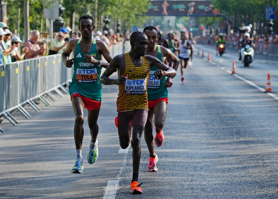 Uganda's Victor Kiplangat (C), Ethiopia's Tamirat Tola (L) and Leul Gebresilase compete during the men's marathon at the World Athletics Championships in Budapest, Hungary, Aug. 27, 2023. (Photo by Aleksandra Szmigiel/Pool/handout via Xinhua)