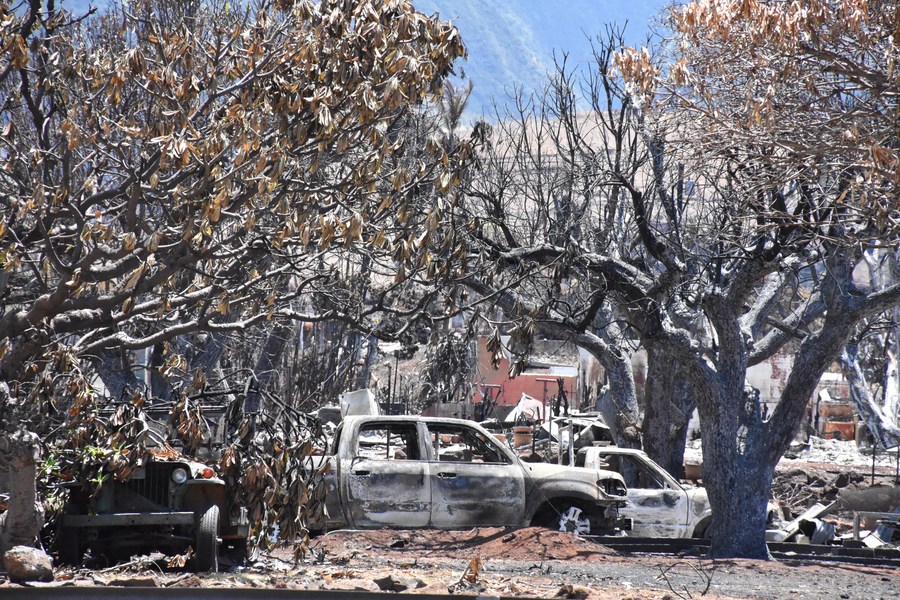 This photo taken on Aug. 20, 2023 shows the aftermath of wildfires in Lahaina town, Maui Island, Hawaii, the United States. (Photo by Zeng Hui/Xinhua)