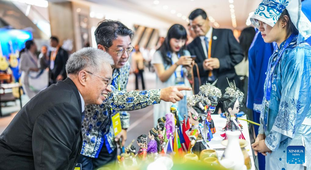 Attendees look at artifacts during the 2023 China-ASEAN Education Cooperation Week in Gui'an New Area, southwest China's Guizhou Province, Aug. 29, 2023. The 2023 China-ASEAN Education Cooperation Week kicked off here on Tuesday. (Xinhua/Tao Liang)