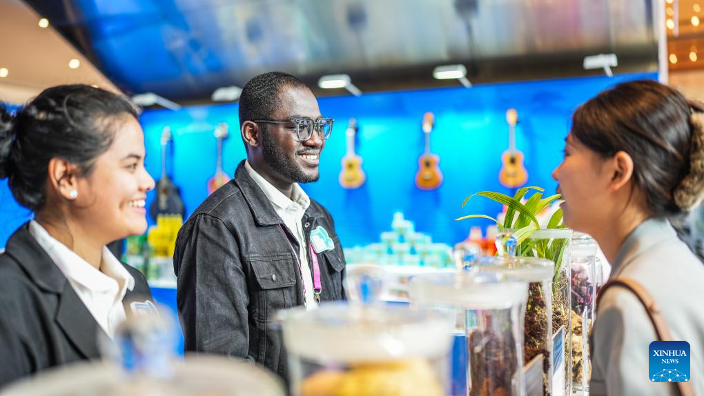 Foreign students communicate with an attendee during the 2023 China-ASEAN Education Cooperation Week in Gui'an New Area, southwest China's Guizhou Province, Aug. 29, 2023. The 2023 China-ASEAN Education Cooperation Week kicked off here on Tuesday. (Xinhua/Tao Liang)