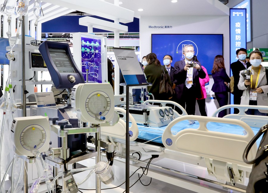 Photo taken on Nov. 5, 2020 shows Medtronic's new generation of ECMO machine at the Medical Equipment and Healthcare Products exhibition area during the third China International Import Expo (CIIE) in Shanghai, east China. (Xinhua/Liu Ying)