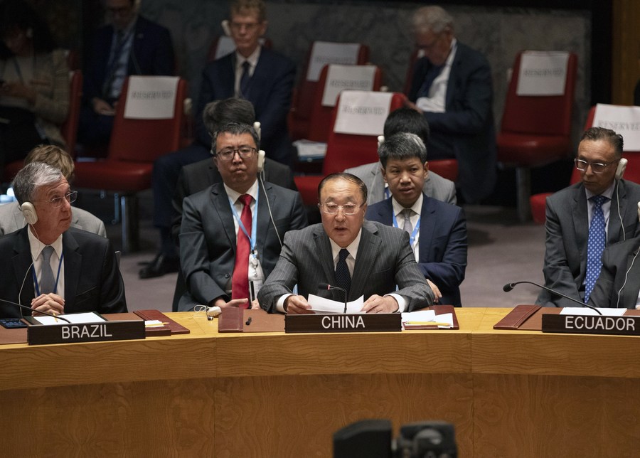 Zhang Jun (C, front), China's permanent representative to the United Nations, speaks during a UN Security Council open debate on famine and conflict-induced global food insecurity at the UN headquarters in New York, Aug. 3, 2023. (Xinhua/Xie E)