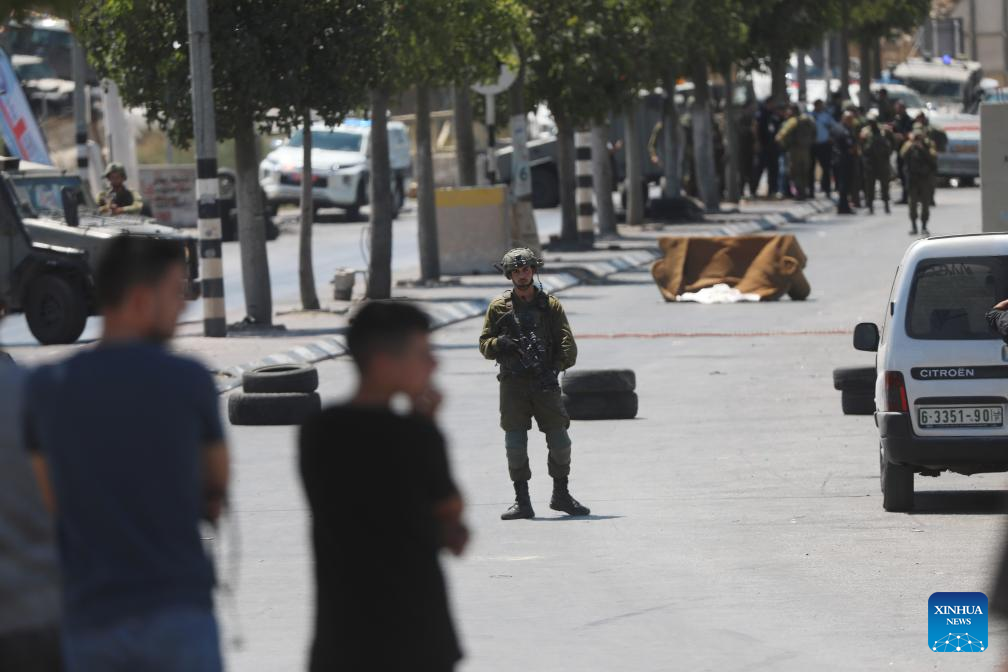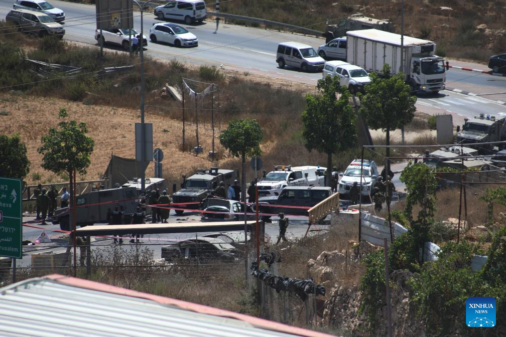 Members of Israeli forces are seen near the site of a reported attack in the south of the West Bank city of Hebron, Aug. 30, 2023. Israeli troops shot a Palestinian after he allegedly carried out a car-ramming attack in the occupied West Bank on Wednesday, Israeli and Palestinian sources said. (Photo by Mamoun Wazwaz/Xinhua)