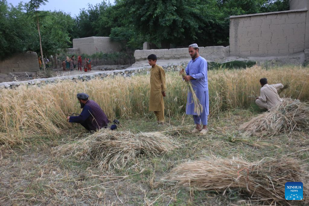 Mohammad Nasim (1st L) works in a field in Chaparhar district in east Afghanistan's Nangarhar Province, May 15, 2023. (Photo by Saifurahman Safi/Xinhua)