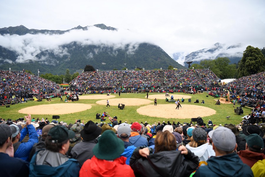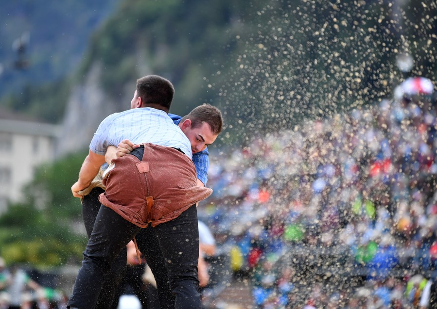 Wrestlers compete during the 2023 Unspunnen Festival in Interlaken, Switzerland, Aug. 27, 2023. (Xinhua/Lian Yi)