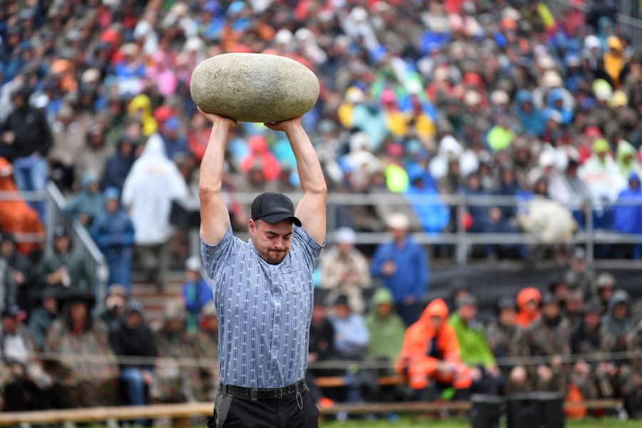 A man participates in stone-throwing competition during the 2023 Unspunnen Festival in Interlaken, Switzerland, Aug. 27, 2023. (Xinhua/Lian Yi)