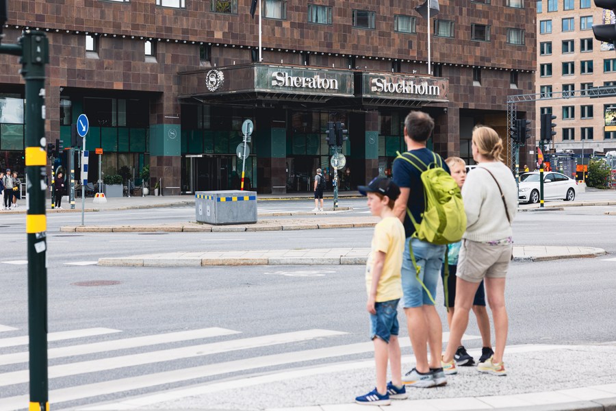 People wait to cross a road in Stockholm, capital of Sweden, July 26, 2023. (Photo by Wei Xuechao/Xinhua) ■