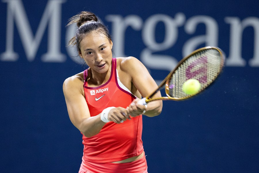 Zheng Qinwen of China hits a return during the women's singles first round match against Nadia Podoroska of Argentina at the 2023 US Open tennis championships in New York, Aug. 29, 2023. (Xinhua/Liu Jie)