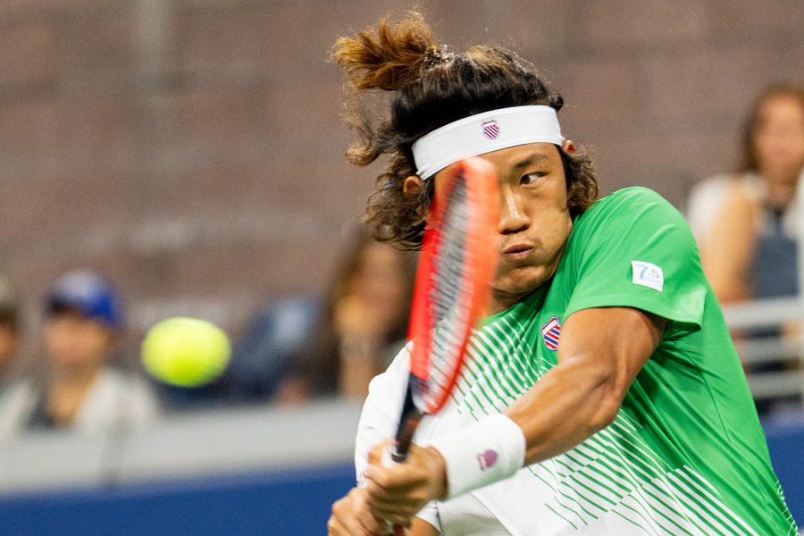 Zhang Zhizhen hits a return during the men's singles second round match against Casper Ruud of Norway at the 2023 US Open tennis championships in New York, the United States, Aug. 30, 2023. (Xinhua/Liu Jie)