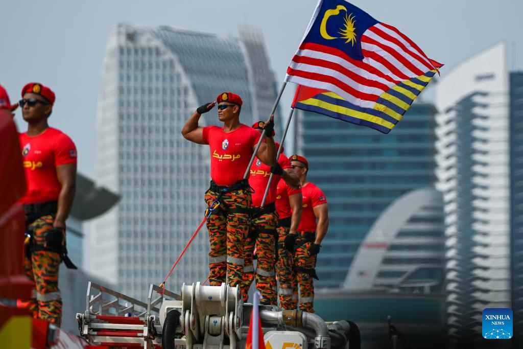 Firefighters attend a celebration of the 66th anniversary of Malaysia's independence in Putrajaya, Malaysia, Aug. 31, 2023. Malaysia celebrated the 66th anniversary of its independence with parades, fireworks and large scale gatherings on Thursday under the theme of unifying ties between its diverse groups.