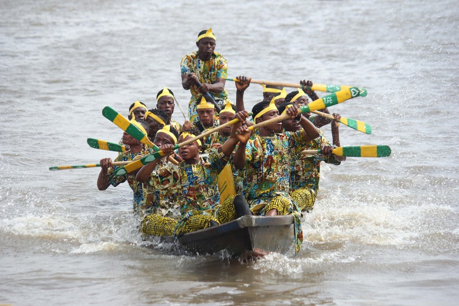 People take part in a canoe race during the 3rd edition of the festival of water sports, culture and arts of Ganvie, in Ganvie, near Cotonou, Benin, Aug. 26, 2023. (Photo by Seraphin Zounyekpe/Xinhua)