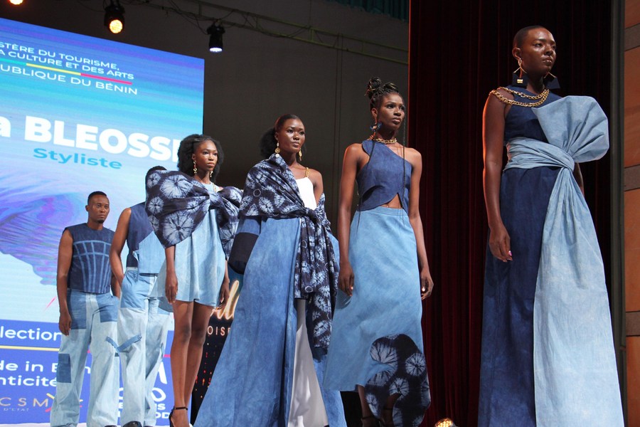 Models present creations during the Benin Fashion Night in Cotonou, Benin on July 22, 2023. The fashion show was part of the Benin Fashion Month held from July 1 to 22. (Photo by Seraphin Zounyekpe/Xinhua)
