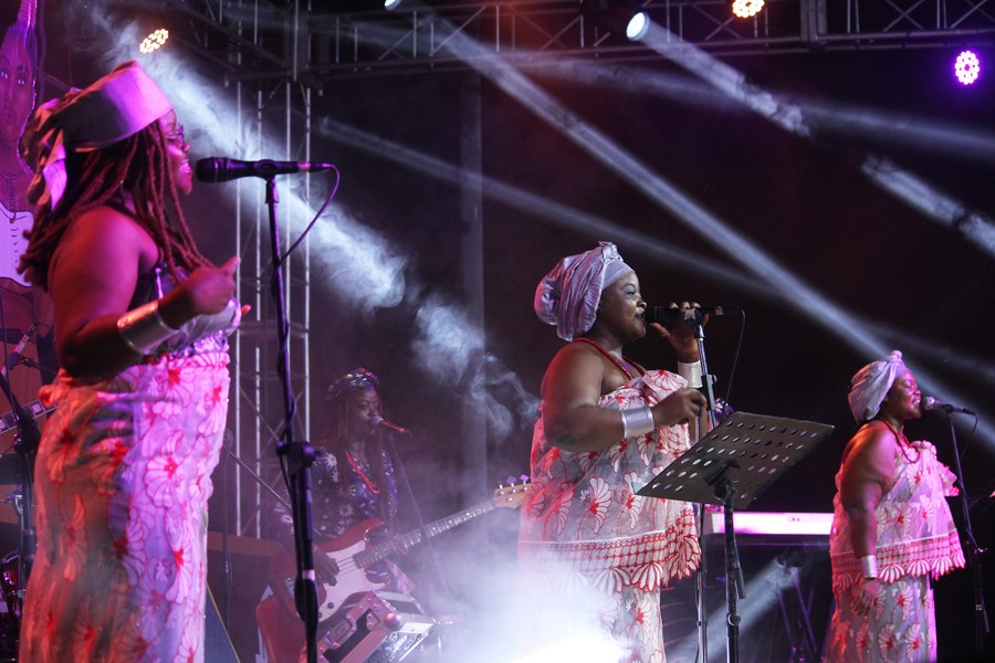 Artists perform during a concert highlighting traditional Beninese music at the Congress Palace of Cotonou, Benin, on March 25, 2023. (Photo by Seraphin Zounyekpe/Xinhua)