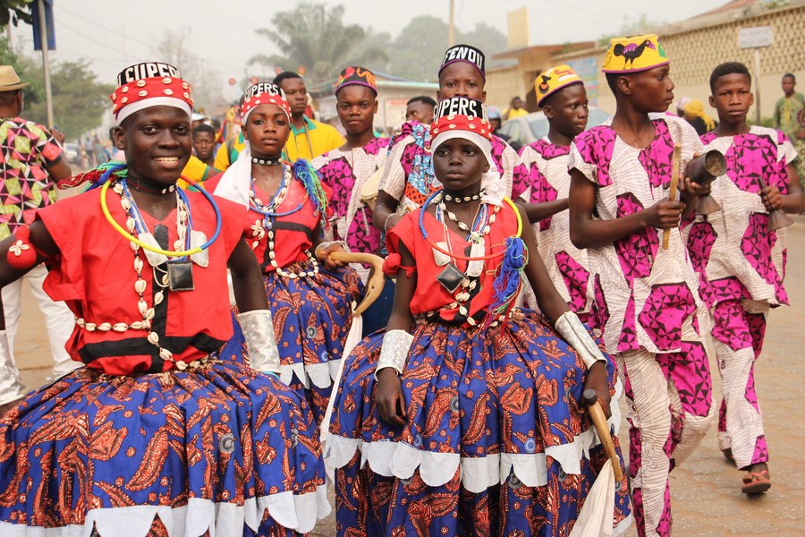 People take part in a parade during the Benin International Arts Festival in Ouidah, Benin, Feb. 17, 2023. (Photo by Seraphin Zounyekpe/Xinhua)
