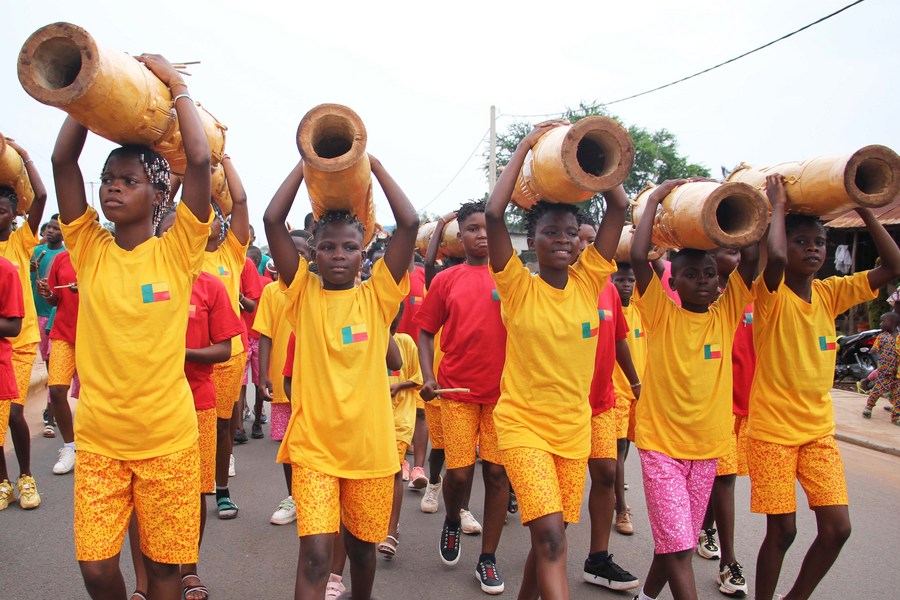 People take part in a parade of playing folk drums in Porto-Novo, Benin, on July 24, 2023. (Photo by Seraphin Zounyekpe/Xinhua)