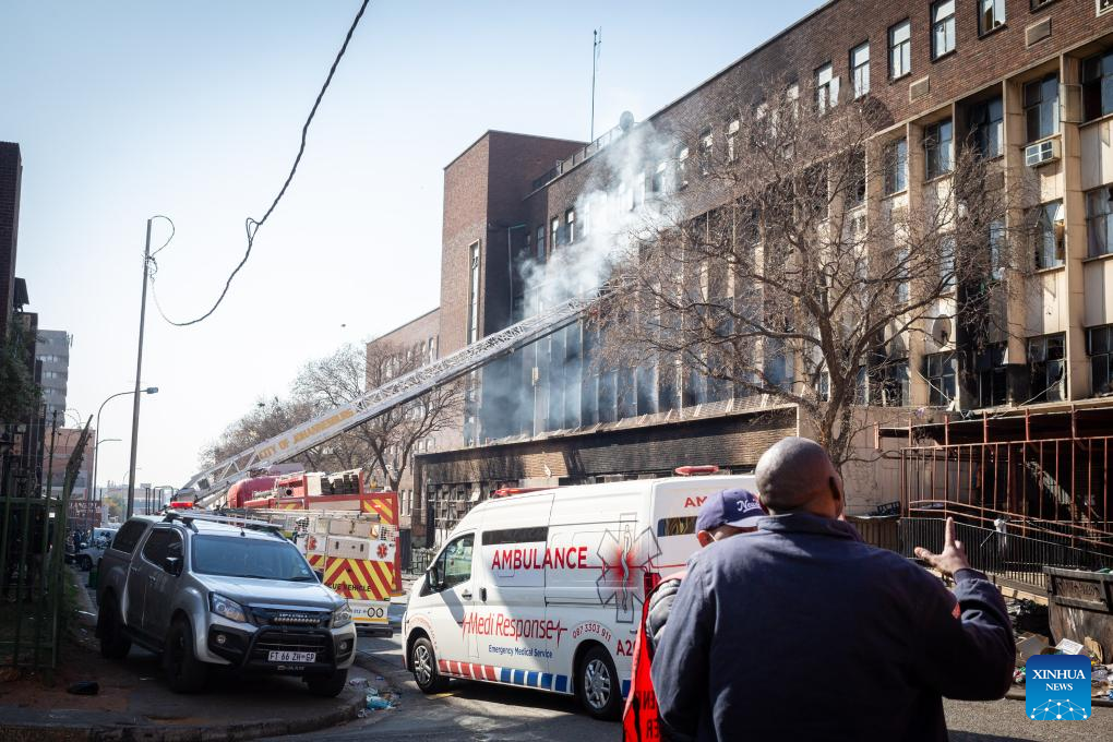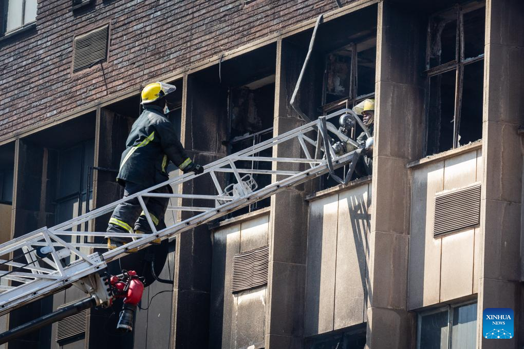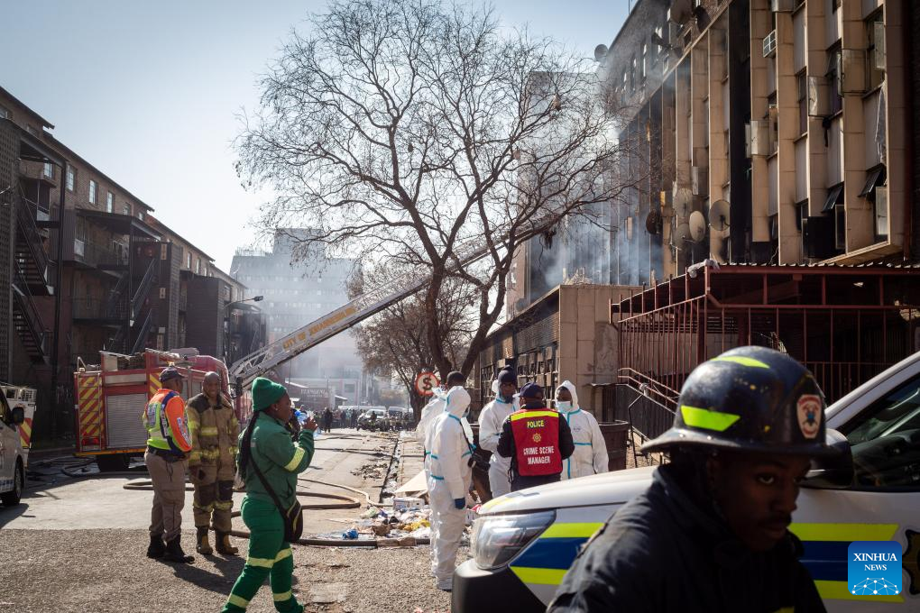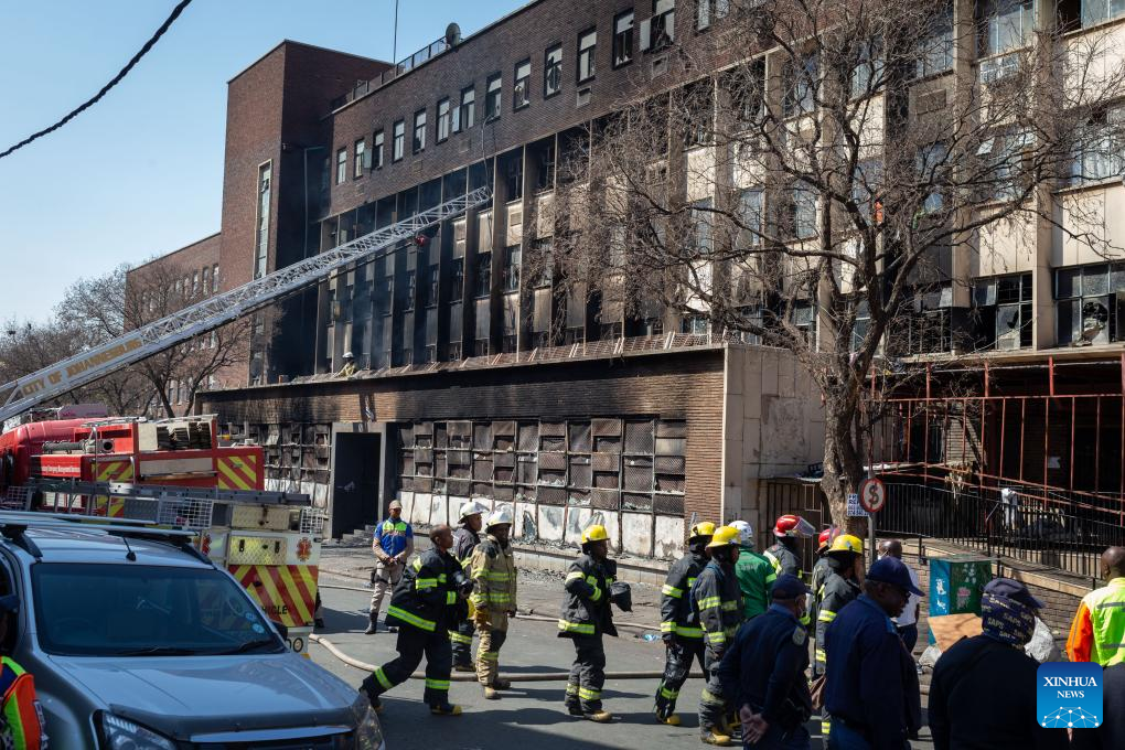 This photo taken on Aug. 31, 2023 shows the fire site in Johannesburg, South Africa. The death toll caused by a building fire in the city center of Johannesburg, South Africa, has risen to 73, an official said Thursday. (Photo by Yeshiel Panchia/Xinhua)