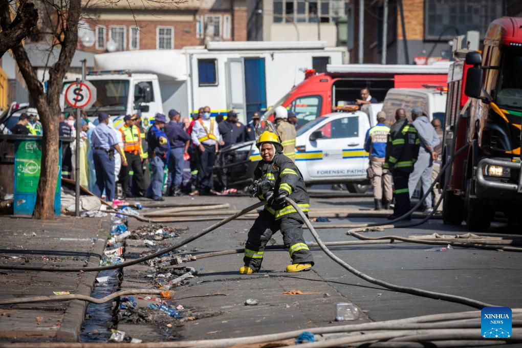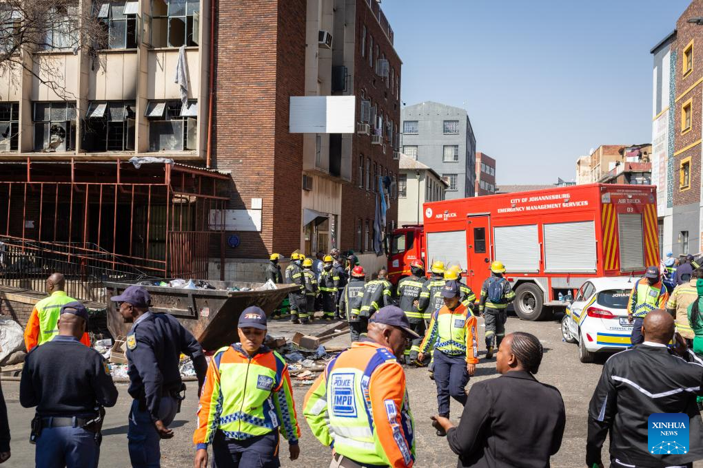 This photo taken on Aug. 31, 2023 shows the site of a building fire in Johannesburg, South Africa. The death toll caused by a building fire in the city center of Johannesburg has risen to 73, an official said Thursday. (Photo by Yeshiel Panchia/Xinhua)
