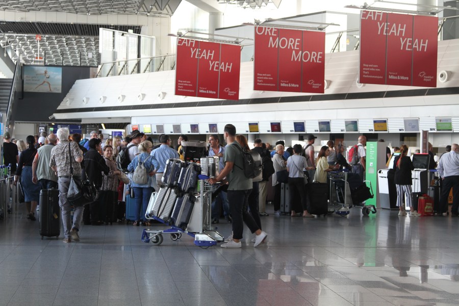 Passengers check in at an international airport in Frankfurt, Germany, June 12, 2023. (Xinhua/Shan Weiyi)