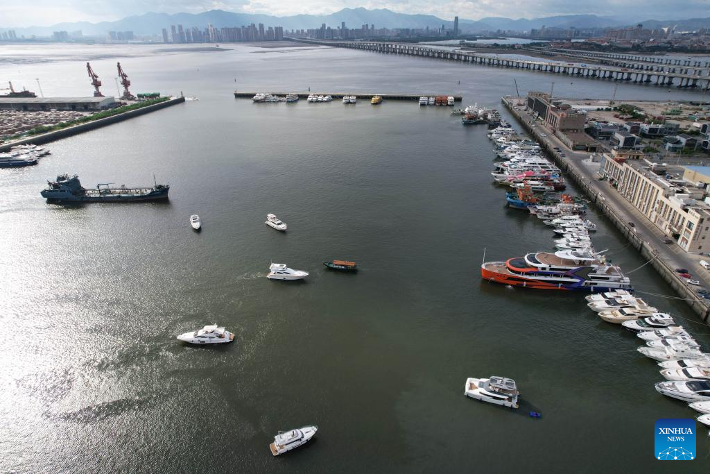 Boats are to take shelter from the approaching Typhoon Saola in Quanzhou, southeast China's Fujian Province, Aug. 30, 2023. In response to the approaching super typhoon Saola, multiple cities in coastal Chinese provinces, including Guangdong and Fujian, have postponed the start of the upcoming new school semester, suspended train and ferry operations, and directed fishing boats in the affected waters to return to ports for safety. (Xinhua/Wei Peiquan)