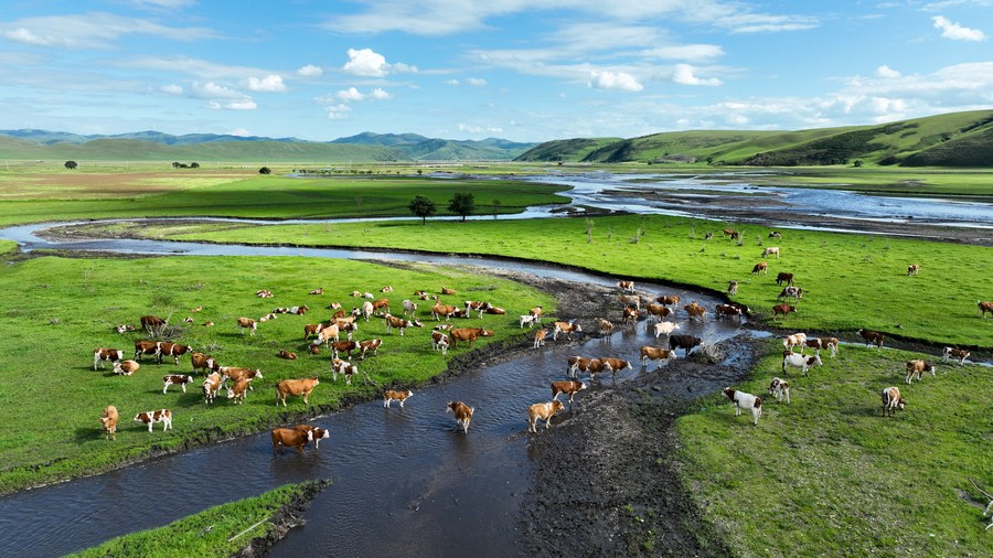 This aerial photo taken on July 24, 2023 shows a herd of cattle on the Ulan Mod grassland, in Horqin Right Wing Front Banner, Hinggan League, north China's Inner Mongolia Autonomous Region. (Xinhua/Bei He)