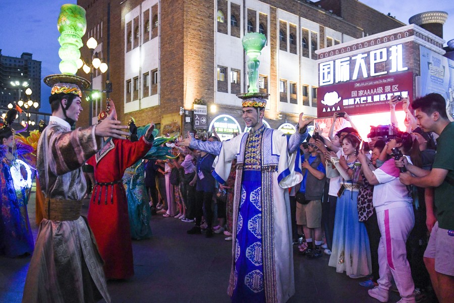 Actors perform at the Xinjiang International Grand Bazaar in Urumqi, northwest China's Xinjiang Uygur Autonomous Region, Aug. 28, 2023. (Xinhua/Wang Fei)