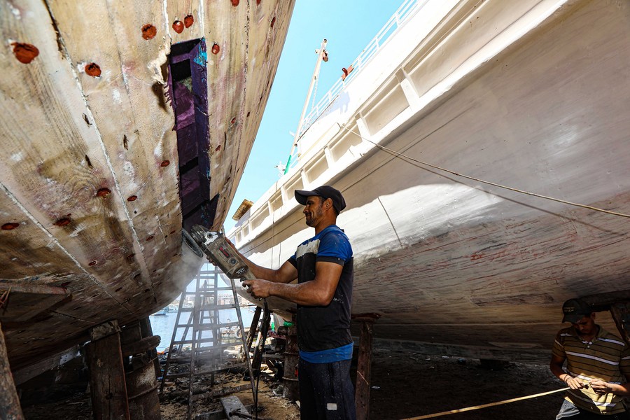 Workers work on building a ship at a workshop along the Nile River in Damietta Governorate, Egypt, Aug. 22, 2023. (Xinhua/Ahmed Gomaa)