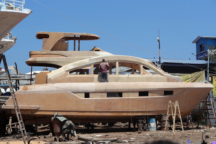 A worker polishes a yacht under construction at a workshop along the Nile River in Damietta Governorate, Egypt, Aug. 22, 2023. (Xinhua/Ahmed Gomaa)