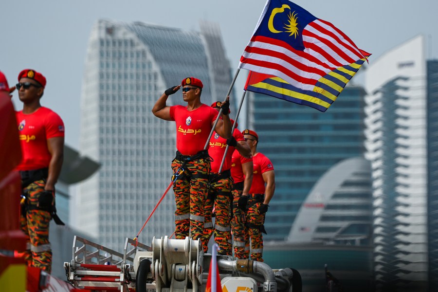 Firefighters attend a celebration of the 66th anniversary of Malaysia's independence in Putrajaya, Malaysia, on Aug. 31, 2023. (Photo by Chong Voon Chung/Xinhua)
