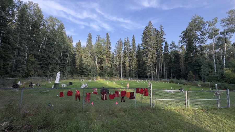 Toys and pink flags are seen placed on the ground to mark suspected child or infant graves in Beauval, Saskatchewan, Canada, on Aug. 31, 2023. (Photo by Li Haitao/Xinhua)