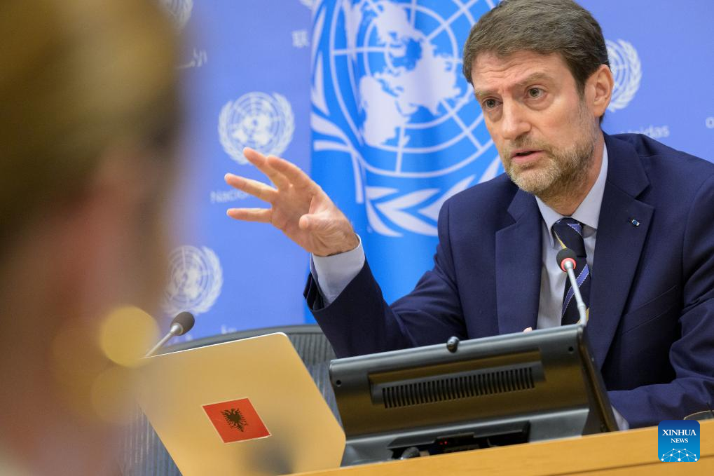 Ferit Hoxha, Albania's UN ambassador, whose country holds the Security Council presidency for the month, briefs reporters at the UN headquarters in New York, on Sept. 1, 2023. Ukrainian President Volodymyr Zelensky is expected to come to the United Nations headquarters in September, said Ferit Hoxha. (Manuel Elías/UN Photo/Handout via Xinhua)