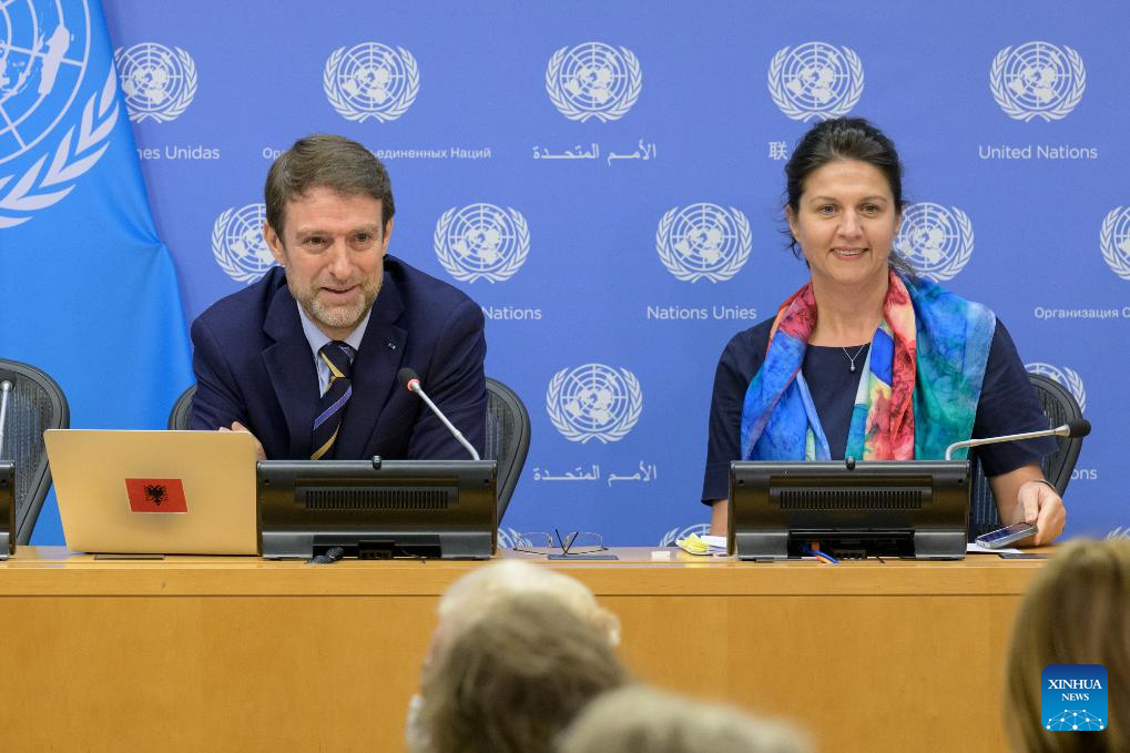 Ferit Hoxha (L), Albania's UN ambassador, whose country holds the Security Council presidency for the month, briefs reporters at the UN headquarters in New York, on Sept. 1, 2023. Ukrainian President Volodymyr Zelensky is expected to come to the United Nations headquarters in September, said Ferit Hoxha. (Manuel Elías/UN Photo/Handout via Xinhua)