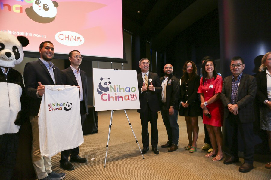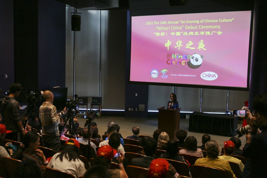 People attend a debut ceremony of China's new tourism brand Nihao!China during the Evening of Chinese Culture event at Citi Field baseball park in New York, the United States, Sept. 1, 2023. (Xinhua/Zhang Fengguo)