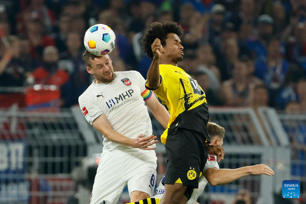 Karim Adeyemi (R) of Borussia Dortmund vies with Patrick Mainka of FC Heidenheim during the first division of Bundesliga 3rd round match between Borussia Dortmund and FC Heidenheim in Dortmund, Germany, Sept. 1, 2023. (Photo by Joachim Bywaletz/Xinhua)