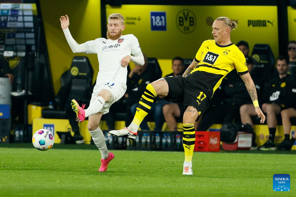 Marius Wolf (R) of Borussia Dortmund vies with Jan-Niklas Beste of FC Heidenheim during the first division of Bundesliga 3rd round match between Borussia Dortmund and FC Heidenheim in Dortmund, Germany, Sept. 1, 2023. (Photo by Joachim Bywaletz/Xinhua)