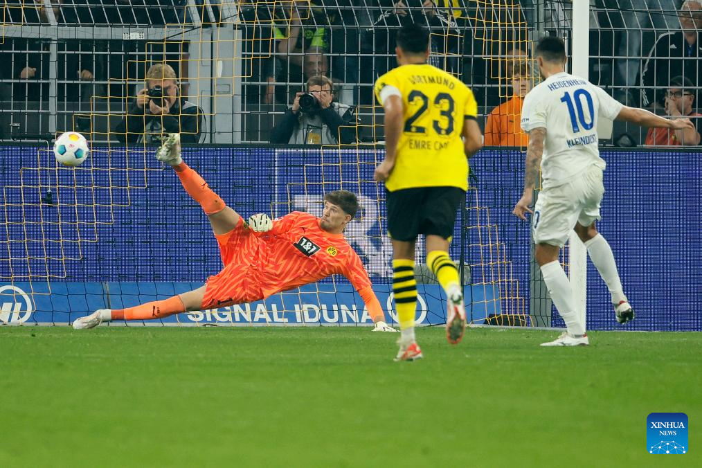Tim Kleindienst (R) of FC Heidenheim shoots to score during the first division of Bundesliga 3rd round match between Borussia Dortmund and FC Heidenheim in Dortmund, Germany, Sept. 1, 2023. (Photo by Joachim Bywaletz/Xinhua)