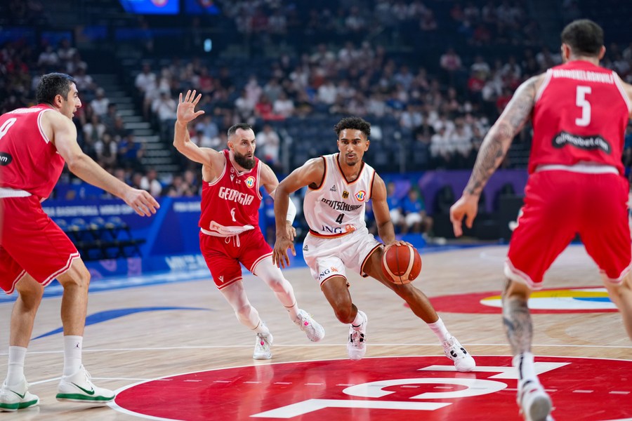 Maodo Lo (2nd R) of Germany controls the ball during the second-round match against Georgia at the 2023 FIBA World Cup in Okinawa, Japan on Sept. 1, 2023. (Xinhua/Zhang Xiaoyu)