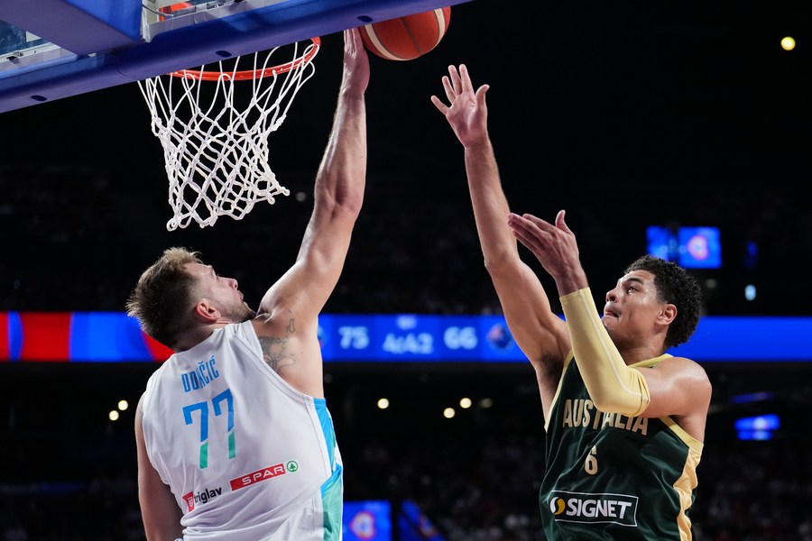 Josh Green (R) of Australia shoots against Luka Doncic of Slovenia during the second round match at the FIBA World Cup 2023 in Okinawa, Japan, Sept. 1, 2023. (Xinhua/Zhang Xiaoyu)