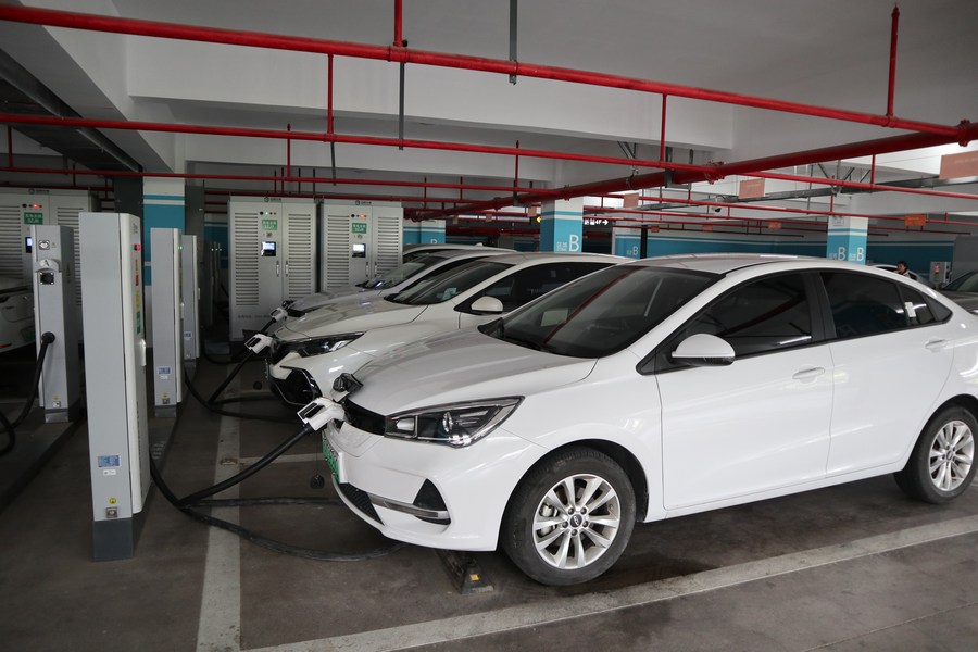 New energy vehicles are charged in a multifunctional NEV charging station in Hefei, capital of east China's Anhui Province, July 4, 2023. (Xinhua/Liu Fangqiang)
