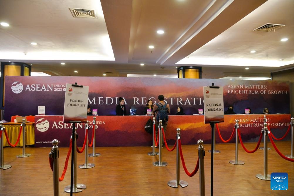 A media worker picks up his ID badge at the media registration desk for the 43rd summit of the Association of Southeast Asian Nations (ASEAN) in Jakarta, Indonesia, Sept. 2, 2023. The 43rd ASEAN summit is set to be held from Sept. 5 to Sept. 7 in Jakarta. (Xinhua/Xu Qin)