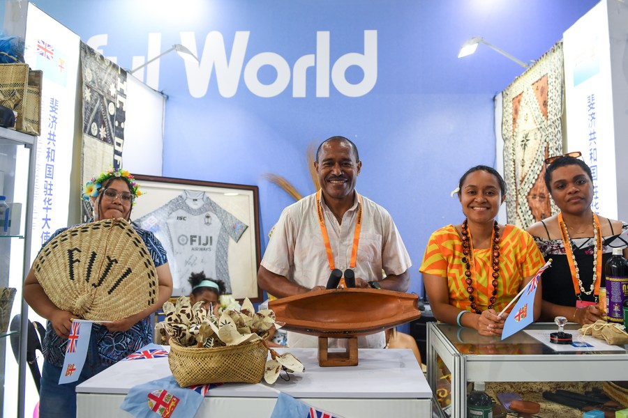 Staff members display Fijian instruments at the exhibition booth of the Fijian embassy in China at the 8th Colourful World -- Cultural Exhibition of Countries along the Belt and Road during the 2023 China International Fair for Trade in Services (CIFTIS) in Beijing, capital of China, Sept. 2, 2023. (Xinhua/Ju Huanzong)