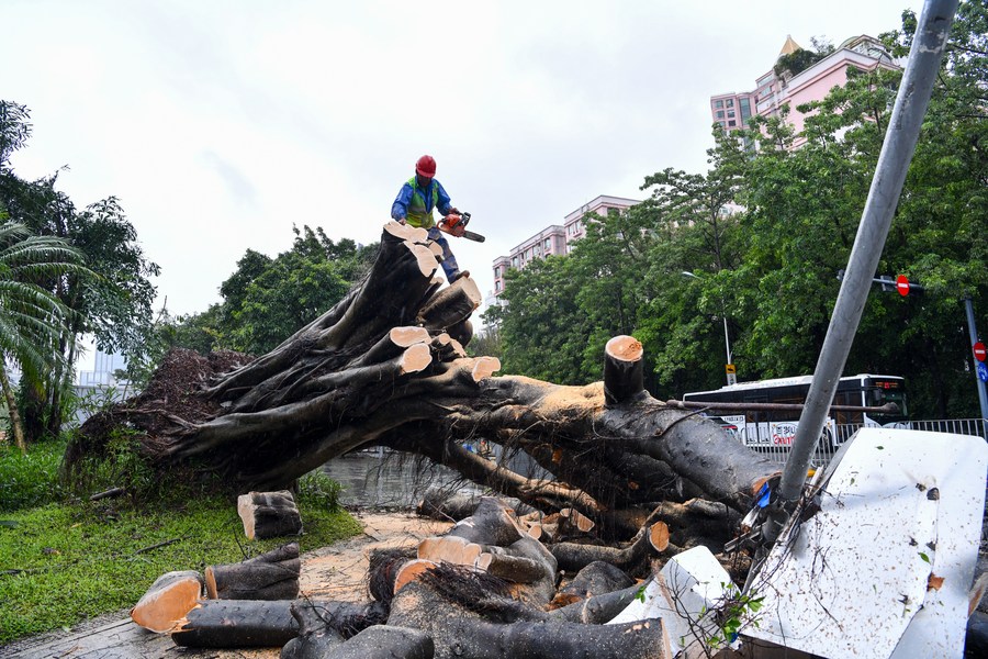 A worker tries to remove a fallen tree along Shennan avenue in Shenzhen, south China's Guangdong Province, Sept. 2, 2023. Typhoon Saola, the ninth typhoon of this year, made landfall in the city of Zhuhai, south China's Guangdong Province at 3:30 a.m. Saturday, according to the province's meteorological observatory. (Xinhua/Liang Xu)