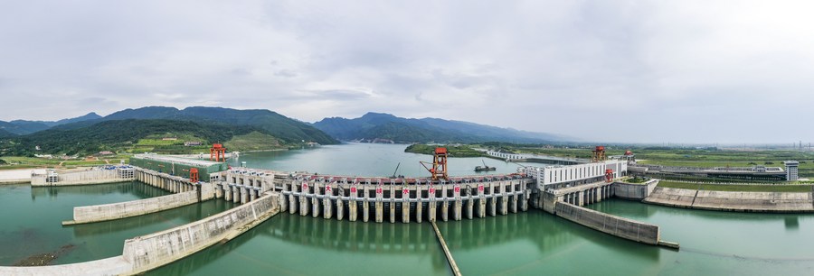 This aerial panoramic photo taken on Sept. 2, 2023 shows the Dateng Gorge Water Conservancy project in Guiping City, south China's Guangxi Zhuang Autonomous Region. The Dateng Gorge Water Conservancy project, started in 2014, is a crucial part of the country's water network to control floods, facilitate shipping, generate electricity, and provide irrigation. The core construction phase of this project was completed on Saturday. (Xinhua/Cao Yiming)