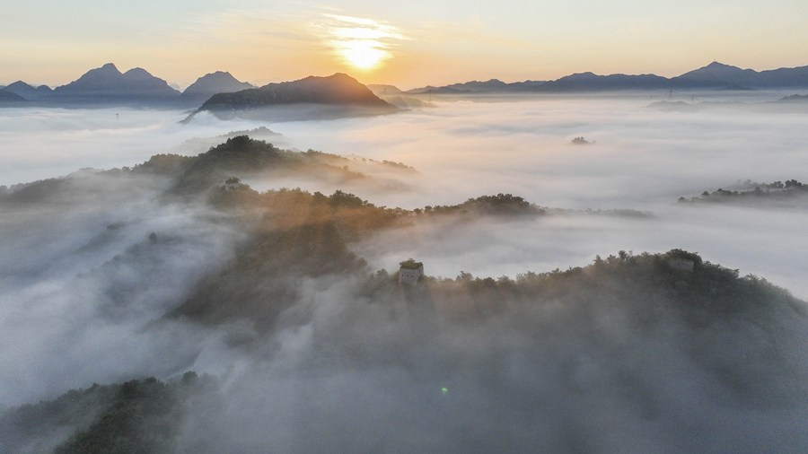 This aerial photo taken on Sept. 2, 2023 shows the morning view of the Hongshankou Great Wall in Zunhua City, north China's Hebei Province. (Photo by Li Lei/Xinhua)